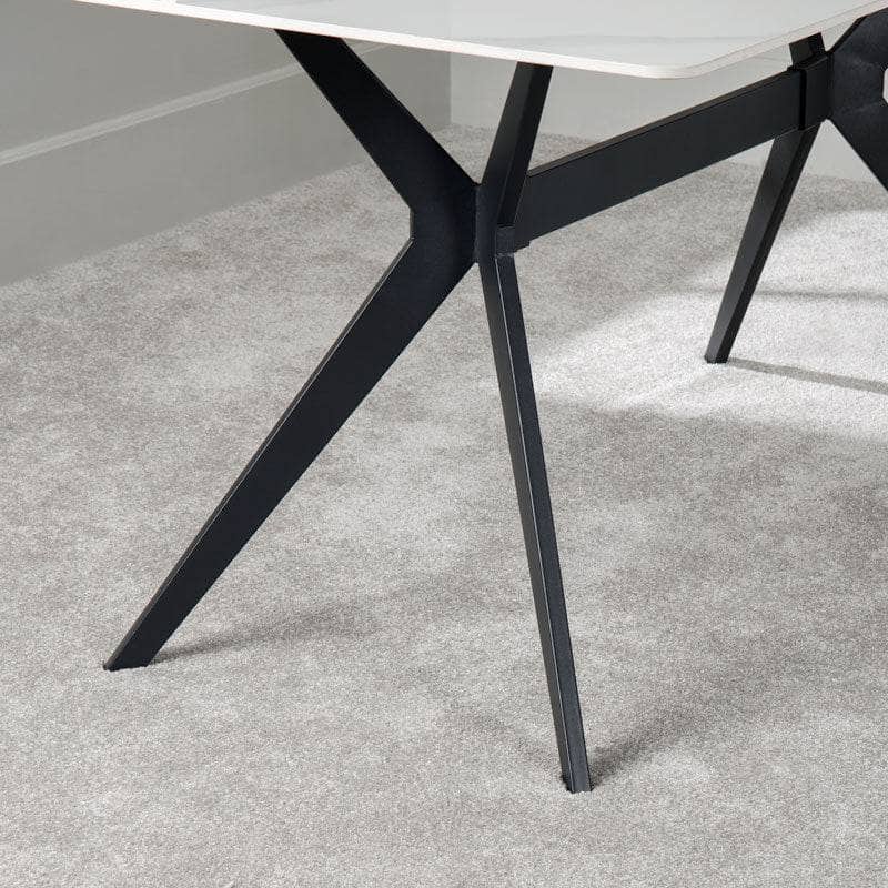 This sleek ceramic dining table boasts an elegant marble-effect top in a classic white colour, offering a chic and sophisticated touch to your dining experience. The sturdy black legs add a modern flair and ensure long-lasting durability, making it an ideal choice for any dining area.